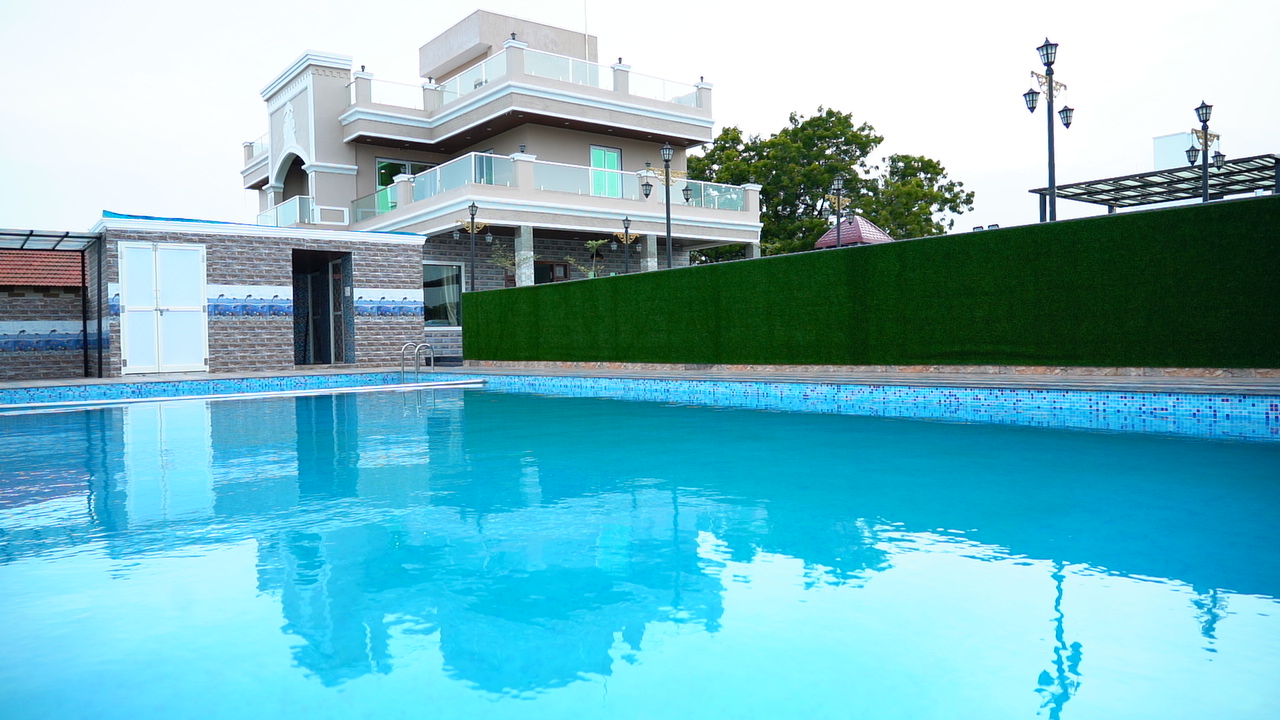 1350 S.Fts . Swimming Pool, 2 Shower Rooms, Bathrooms with jaguar fittings, Open Kitchen with breakfast counter, 6-seater Dining Table, 2 Lawns capacity of 100 Pax,